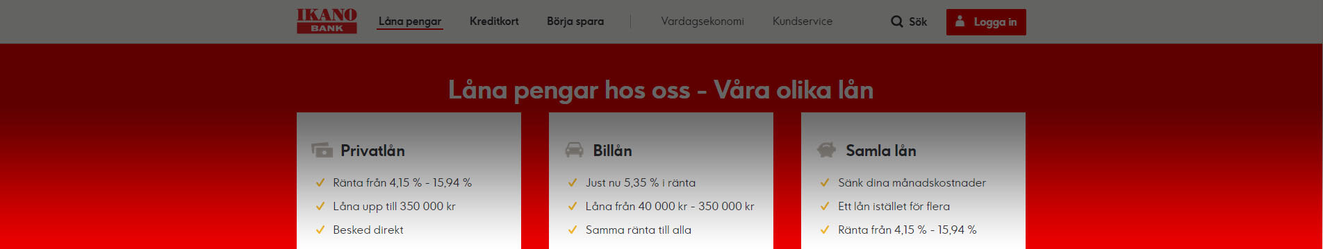 IKANO Bank erbjuder sina kunder ett komplett utbud inom lån och sparande, förutom bolån. Du har möjligheten att ansöka om privatlån upp till 350 000 kr, billån upp till 350 00 kr, ett kreditkort utan årsavgift med kredit upp till 60 000 kr och sparkonton med en konkurrenskraftig ränta.